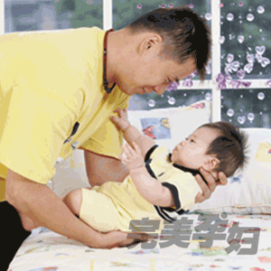 轻轻地把宝宝的屁股放到床上,手仍然放在宝宝的屁股上,另一只支撑住宝宝的头部,不要着急放开。