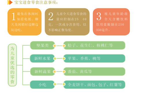 在零食中鼓励儿童选食坚果、种子类,如松子、花生仁、核桃仁等;选食新鲜水果、蔬果,如番茄、黄瓜;小吃可选食全麦饼干、面包、肉菜包子、红薯等。