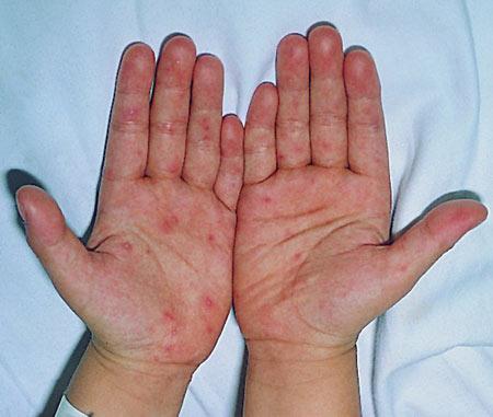 急性起病,发热,手掌或脚掌部出现斑丘疹和疱疹,臀部或膝盖也可出现皮疹。皮疹周围有炎性红晕,疱内液体较少;口腔粘膜出现散在的疱疹,疼痛明显。部分患儿可伴有咳嗽、流涕、食欲不振、恶心、呕吐和头疼等症状。