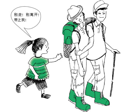 两人一边忙着整理行装,一边劝说女儿:“爸爸妈妈今天要去爬山,你去太危险,还是在家里和阿姨一起玩吧。听话!”