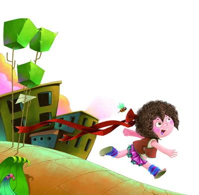 卷毛头就在这儿一边玩一边等。瞧,长长的绸带高兴地在她身后一摇,一晃,就跟真的长辫子那样!