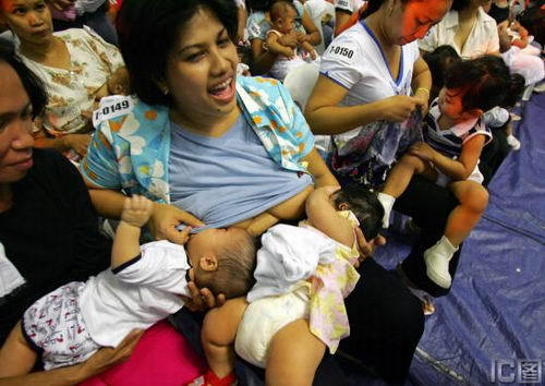 菲律宾妈妈:菲律宾婴儿在4—5个月纯母乳的比率从过去的20%降至现在的16%,因此,今年菲律宾组织了3738名妈妈,在首都马尼拉体育馆集体给婴儿喂奶1分钟。