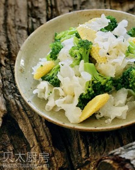 银耳、玉米笋和西兰花都是营养非常丰富的食材,微炒之后吃起来十分清新爽脆,颜色也非常明快,让人看起来就很有食欲。