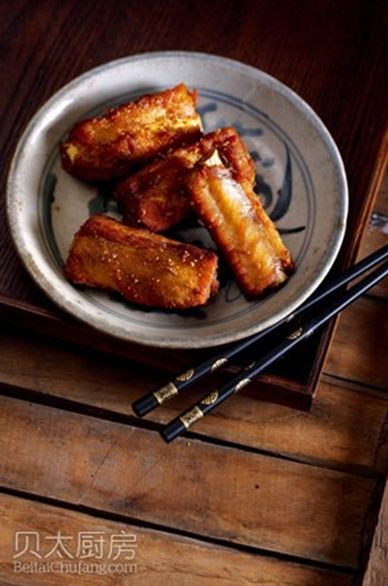 6. 锅中放油(实耗50g),油温达到80摄氏度时,放入排骨,中火慢炸,大约2分钟后捞出。将所有的排骨都煎炸好后,开大火,用高油温再次煎炸一遍,使排骨最终上色。