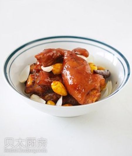 1. 将猪脚清洗干净,用热水汆烫一下,之后与银杏、姜、葱段、草果、大料一同放入砂锅中炖煮到软烂。