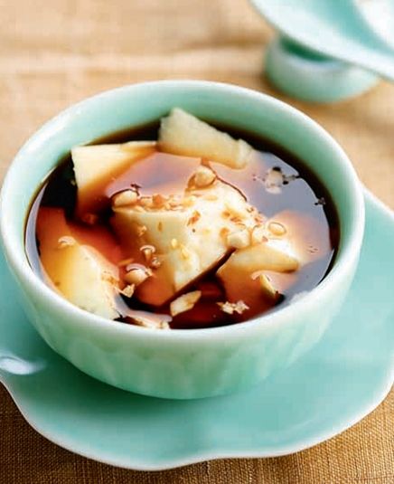 ★ 如果想吃柠檬口味的糖汁,可以这样做:用小火熬煮3 汤匙黄糖和100 毫升纯净水 ,沸腾后继续加热3 分钟,熬成琥珀色的糖汁后,再挤入柠檬汁。可以直接将柠檬味糖汁淋在豆花上。