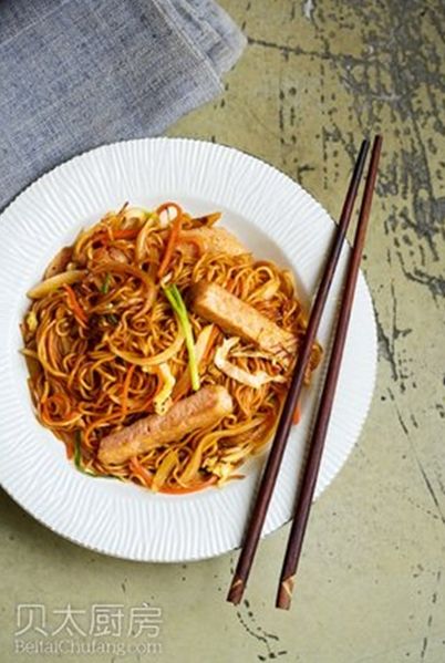 6. 放入煮好的面条,翻几下,之后放入所有调味料,不断的翻炒。出锅前将猪排放入,翻炒几下即可出锅。