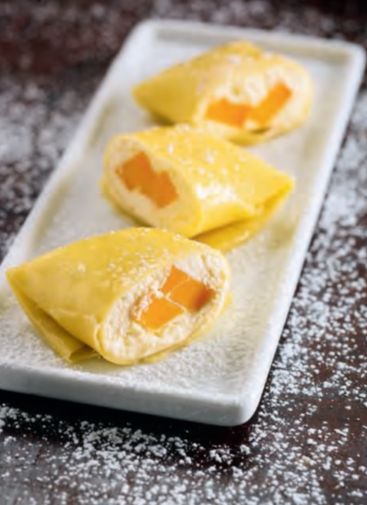 班戟,只有广东人会想出这样的名字,原本在欧洲被叫作“pancake”。初见班戟还是在广州街头,一个转角的小店里。帅气的店员用熟练的动作将一个个班戟卷起折好,甜美地送到你的手上。班戟贵在“直达”,要现做现吃才有感觉,一层薄厚适中的金黄饼皮,中间加入打发的奶油,再放一些芒果、榴莲或者香蕉的果条或者果粒。班戟简单易做,自制的妙处就在于只要你有胆,想放多少奶油就放多少,想放多大块果肉就放多大块。