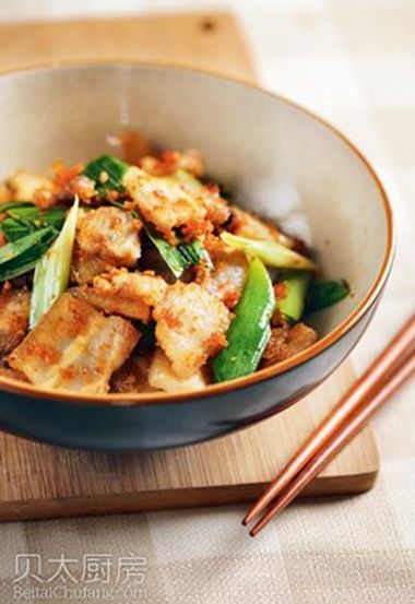3. 肉捞出,放凉后,用刀切成薄片。锅中放油,烧热后,将五花肉片放入,中火炒至焦香。之后放入渣海椒继续翻炒,直到渣海椒出味。最后放入青蒜段,再次翻炒几下即可出锅。